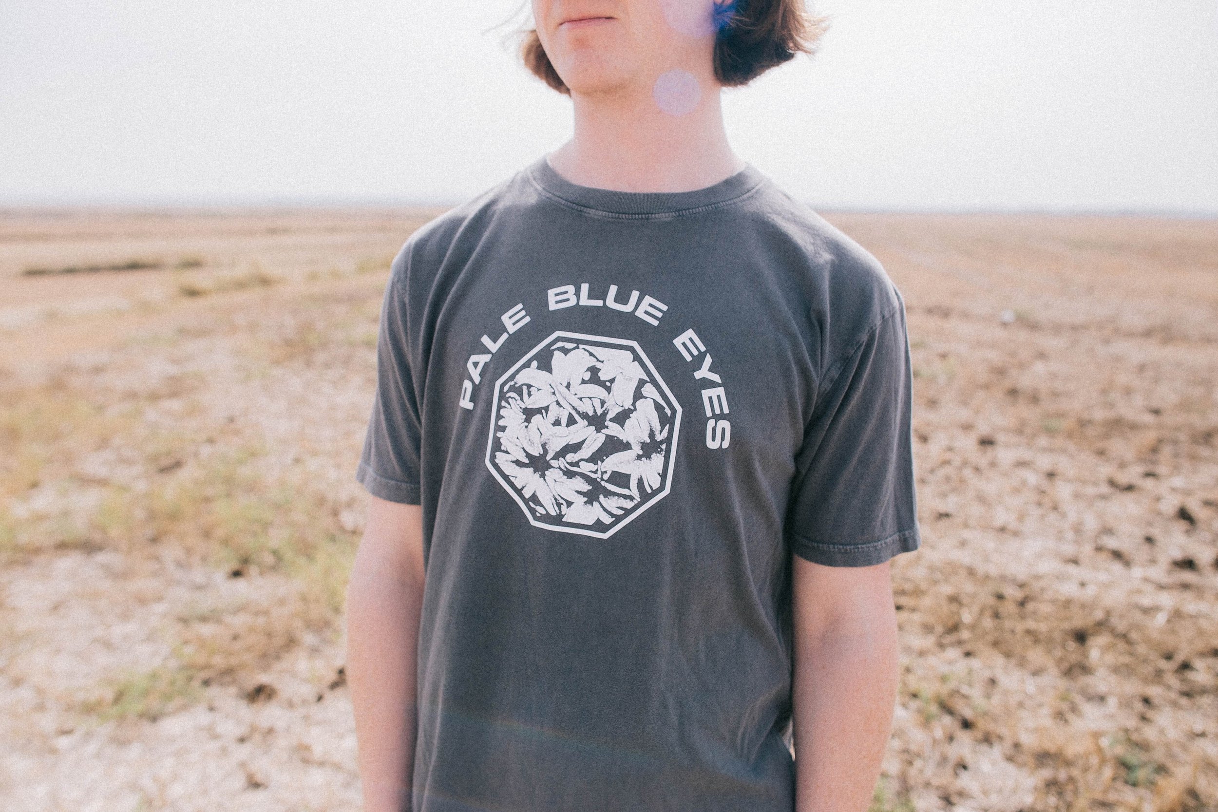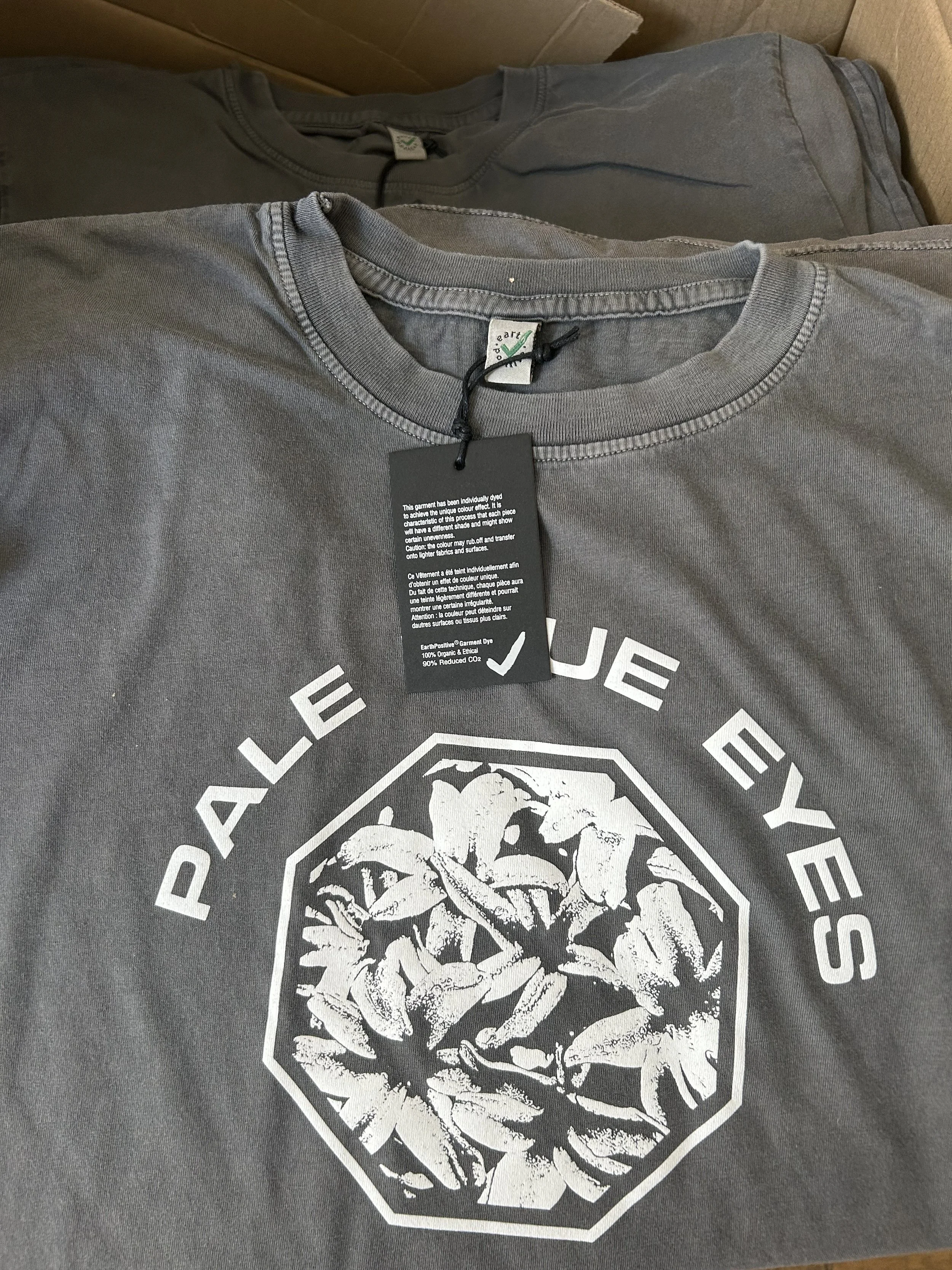 White 'Bloom' design on high quality, earth positive, grey stone-wash T-shirt.